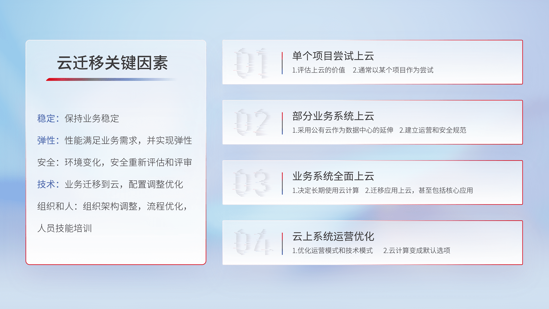 结合实际业务,,从规划设计、、、云平台选型、、、、云原生改造、、数据迁移、、集成交付,,迁移全过程为客户识别最佳上云路径,,,做好风险识别管理,,,设计网络架构、、、身份权限、、、安全审计合规、、、操作审计、、、、日志审计、、监控告警策略、、多站点容灾设计等,,,对云上基础设施进行整体规划,,提升IT治理水平,,,以满足弹性、、、、高可用、、、、高性能的需求。。