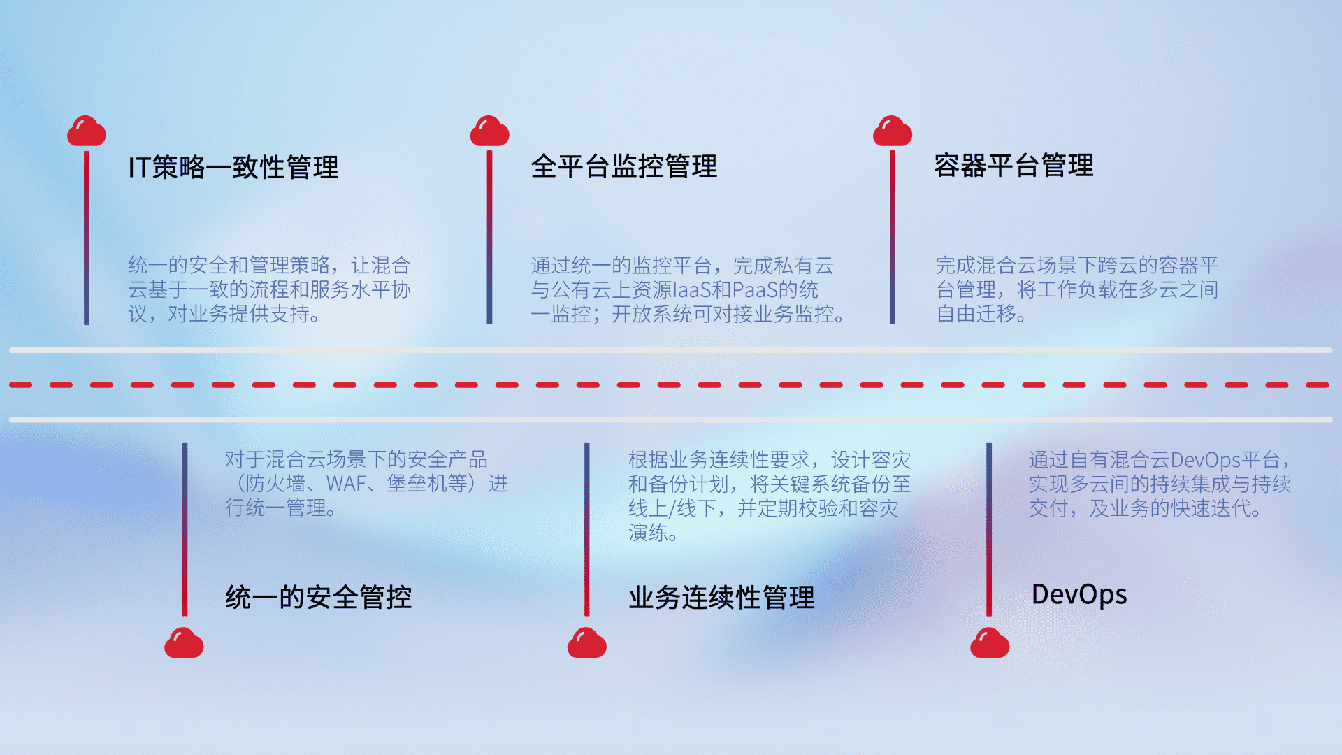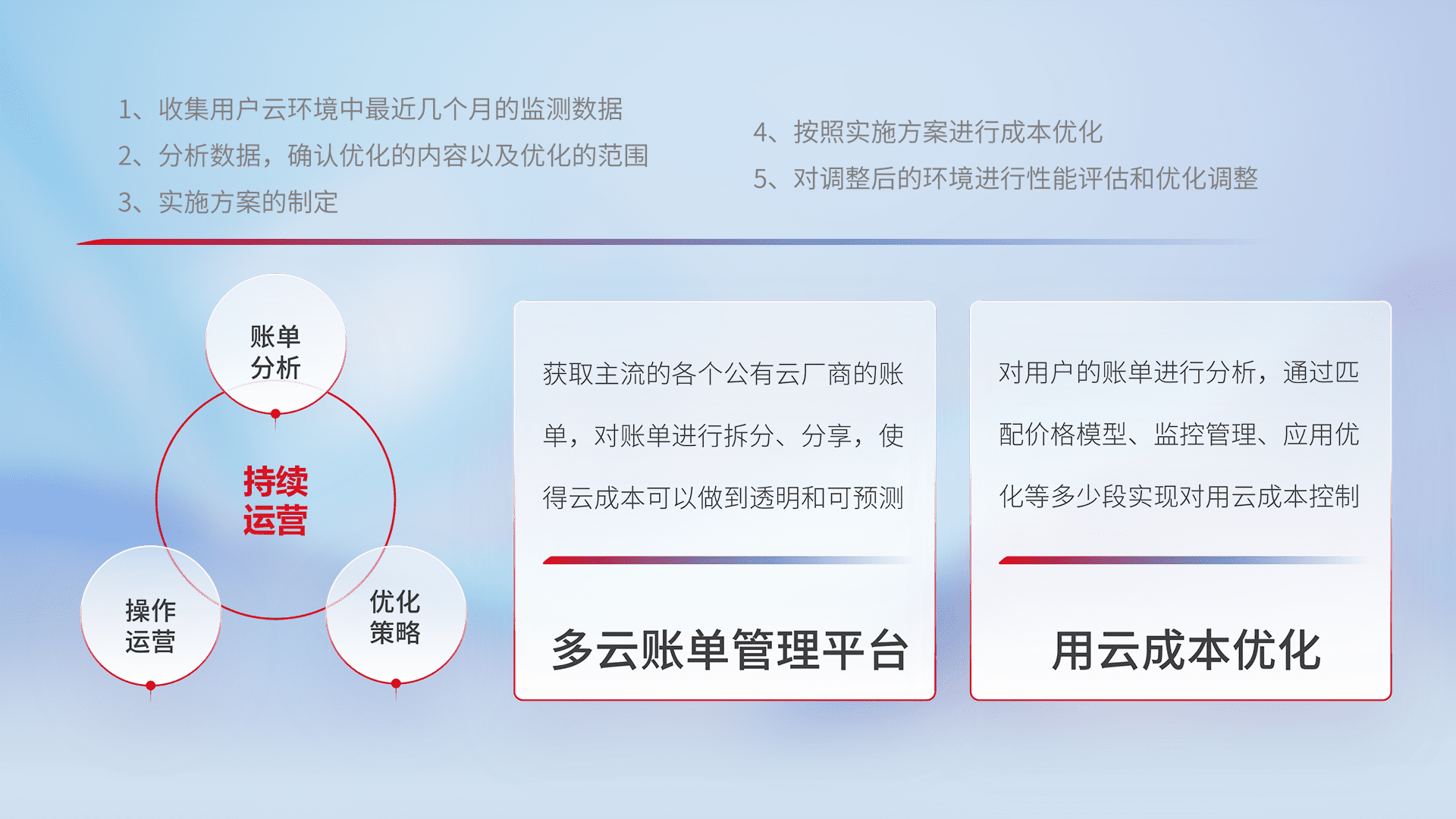 通过多云纳管,,,以统一的资源数据模型把客户的云资源进行抽象和封装,,,,进而实现对多云资源的统一操作,,,,保障云资源管理的可靠性、、、稳定性与可用性。。。量身定制化运维内容,,,,配置、、开发运维、、、补丁管理、、、、备份、、、监控、、认证和访问管理、、审计和日常巡检等,,,保障在用云过程中的可靠度,,稳定度以及高可用率。。