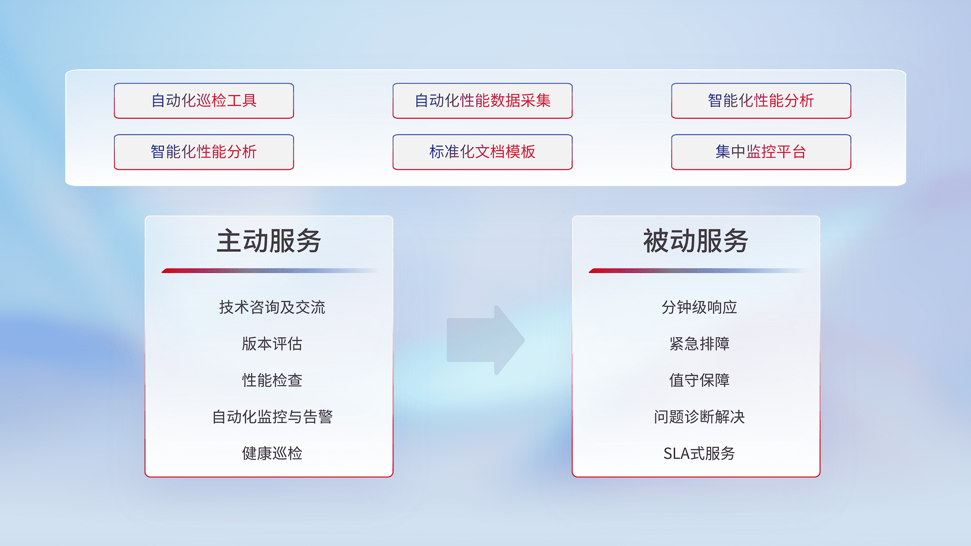 智能化工具和标准化文档,,,保障服务质量,,,,提供主动服务(包含技术咨询、、版本评估、、、性能检查、、、自动化监控与告警、、、健康巡检)和被动服务包含(分钟级响应、、紧急排障、、、值守保障、、问题诊断解决、、、SLA服务)。。。