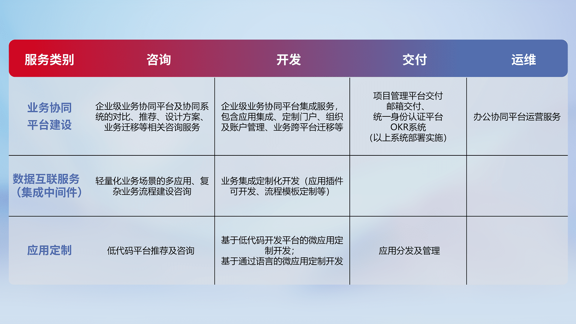 针对钉钉、、企微、、IDaas等平台级产品提供产品的规划、、、方案、、交付、、、、定制化开发等服务,,实现如统一协同办公、、、、智能客户服务、、混合会议管理、、、、智能数据查询、、、、等业务场景,,实现数字化转型。。。